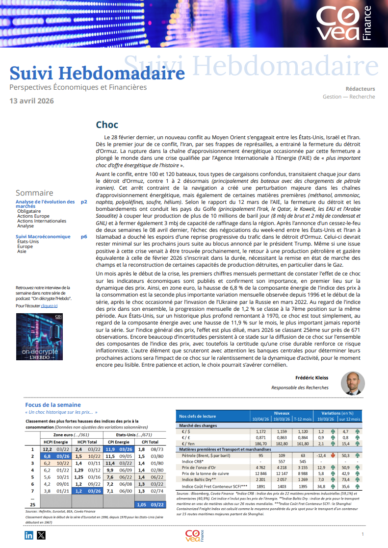 Un mois après le début de la crise, les premiers chiffres mensuels permettant de constater l’effet de ce choc sur les indicateurs économiques sont publiés et confirment son importance, en premier lieu sur la dynamique des prix. Ainsi, en zone euro, la hausse de 6,8 % de la composante énergie de l’indice des prix à la consommation est la seconde plus importante variation mensuelle observée depuis 1996 et le début de la série, après le choc occasionné par l’invasion de l’Ukraine par la Russie en mars 2022. Au regard de l’indice des prix dans son ensemble, la progression mensuelle de 1,2 % se classe à la 7ème position sur la même période. Aux États-Unis, sur un historique plus profond remontant à 1970, ce choc est tout simplement, au regard de la composante énergie avec une hausse de 11,9 % sur le mois, le plus important jamais reporté sur la série. Sur l’indice général des prix, l’effet est plus dilué, mars 2026 se classant 25ème sur près de 671 observations. Encore beaucoup d’incertitudes persistent à ce stade sur la diffusion de ce choc sur l’ensemble des composantes de l’indice des prix, avec toutefois la certitude qu’une crise durable renforce ce risque inflationniste. L’autre élément que scruteront avec attention les banques centrales pour déterminer leurs prochaines actions sera l’impact de ce choc sur le ralentissement de la dynamique d’activité, pour le moment encore peu lisible. Entre patience et action, le choix pourrait s’avérer cornélien.