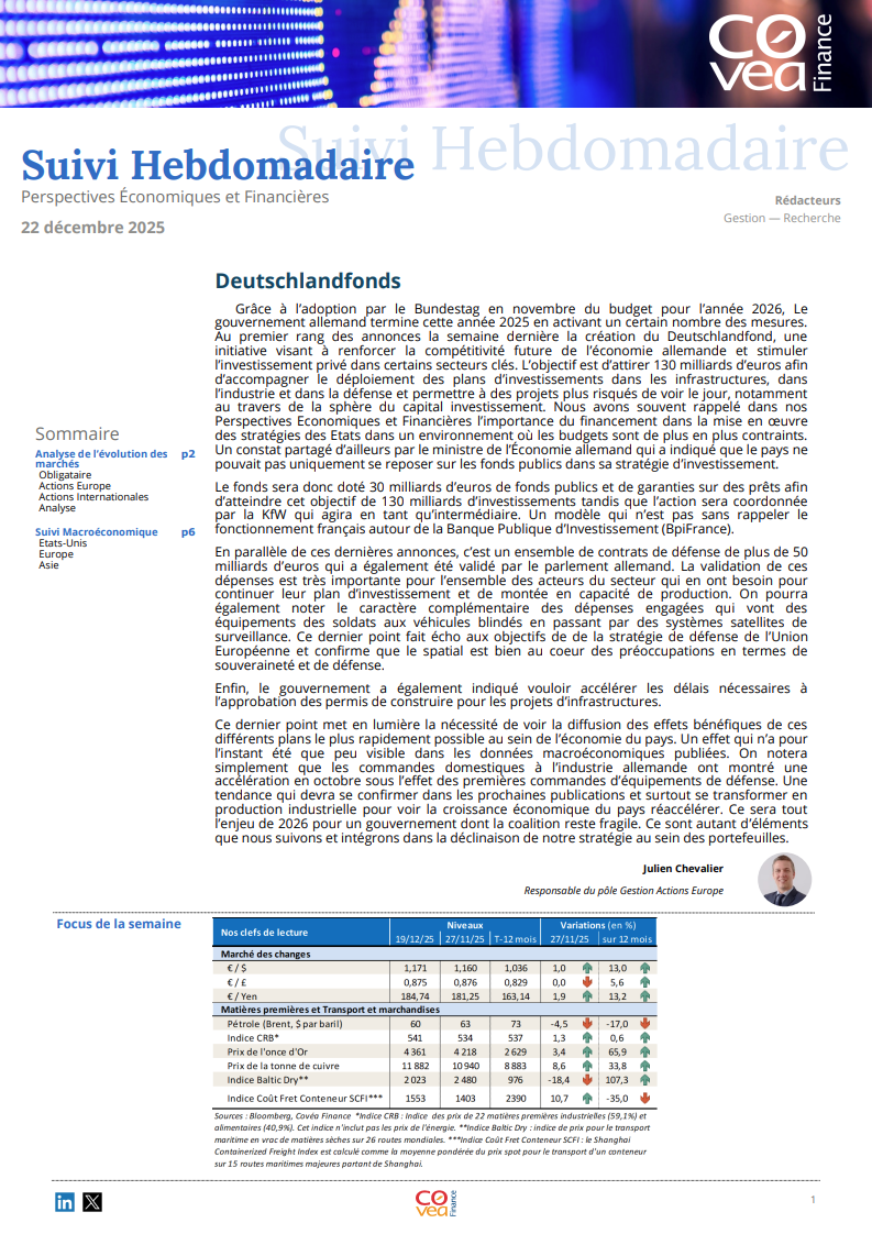 Grâce à l’adoption par le Bundestag en novembre du budget pour l’année 2026, Le gouvernement allemand termine cette année 2025 en activant un certain nombre des mesures. Au premier rang des annonces la semaine dernière la création du Deutschlandfond, une initiative visant à renforcer la compétitivité future de l’économie allemande et stimuler l’investissement privé dans certains secteurs clés. L’objectif est d’attirer 130 milliards d’euros afin d’accompagner le déploiement des plans d’investissements dans les infrastructures, dans l’industrie et dans la défense et permettre à des projets plus risqués de voir le jour, notamment au travers de la sphère du capital investissement. Nous avons souvent rappelé dans nos Perspectives Economiques et Financières l’importance du financement dans la mise en œuvre des stratégies des Etats dans un environnement où les budgets sont de plus en plus contraints. Un constat partagé d’ailleurs par le ministre de l’Économie allemand qui a indiqué que le pays ne pouvait pas uniquement se reposer sur les fonds publics dans sa stratégie d’investissement.