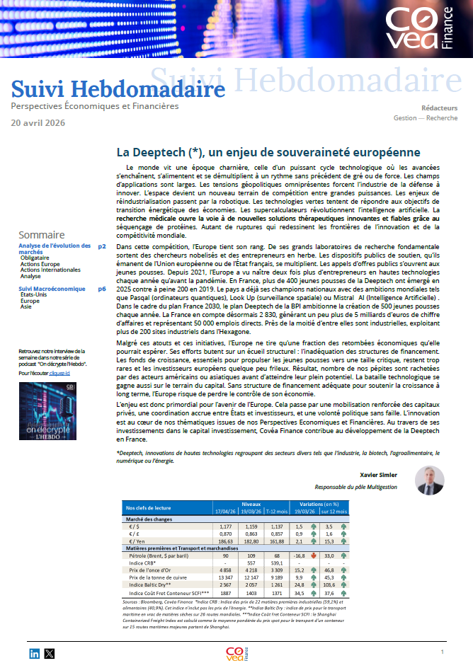 L’enjeu est donc primordial pour l’avenir de l’Europe. Cela passe par une mobilisation renforcée des capitaux privés, une coordination accrue entre États et investisseurs, et une volonté politique sans faille. L’innovation est au cœur de nos thématiques issues de nos Perspectives Économiques et Financières. Au travers de ses investissements dans le capital investissement, Covéa Finance contribue au développement de la Deeptech en France.