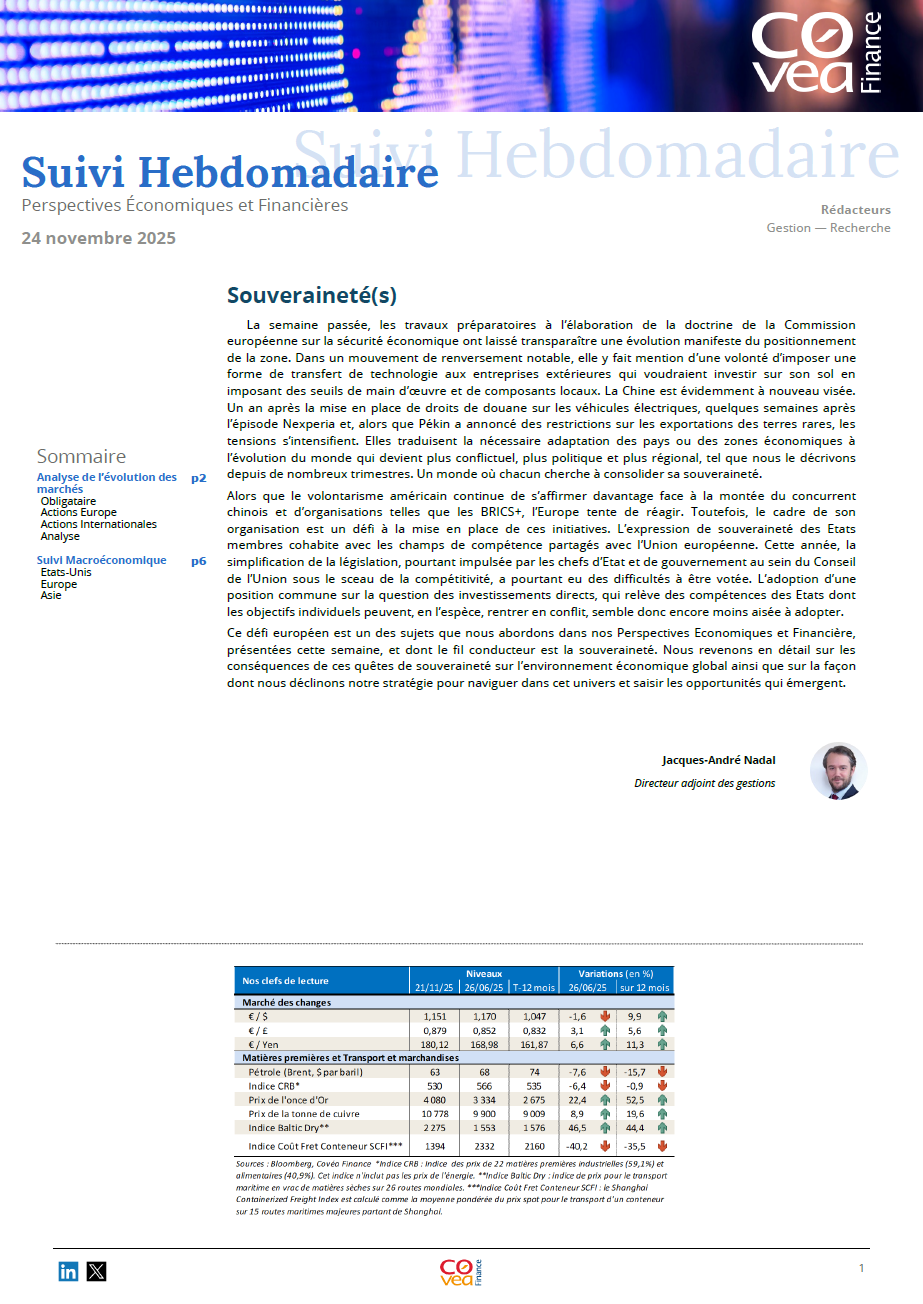 Ce défi européen est un des sujets que nous abordons dans nos Perspectives Economiques et Financière, présentées cette semaine, et dont le fil conducteur est la souveraineté. Nous revenons en détail sur les conséquences de ces quêtes de souveraineté sur l’environnement économique global ainsi que sur la façon dont nous déclinons notre stratégie pour naviguer dans cet univers et saisir les opportunités qui émergent.