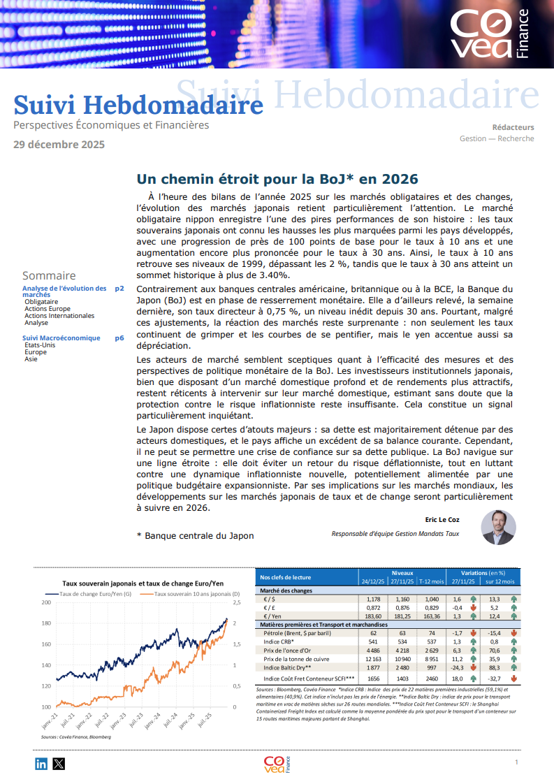 Le Japon dispose certes d’atouts majeurs : sa dette est majoritairement détenue par des acteurs domestiques, et le pays affiche un excédent de sa balance courante. Cependant, il ne peut se permettre une crise de confiance sur sa dette publique. La BoJ navigue sur une ligne étroite : elle doit éviter un retour du risque déflationniste, tout en luttant contre une dynamique inflationniste nouvelle, potentiellement alimentée par une politique budgétaire expansionniste. Par ses implications sur les marchés mondiaux, les développements sur les marchés japonais de taux et de change seront particulièrement à suivre en 2026.